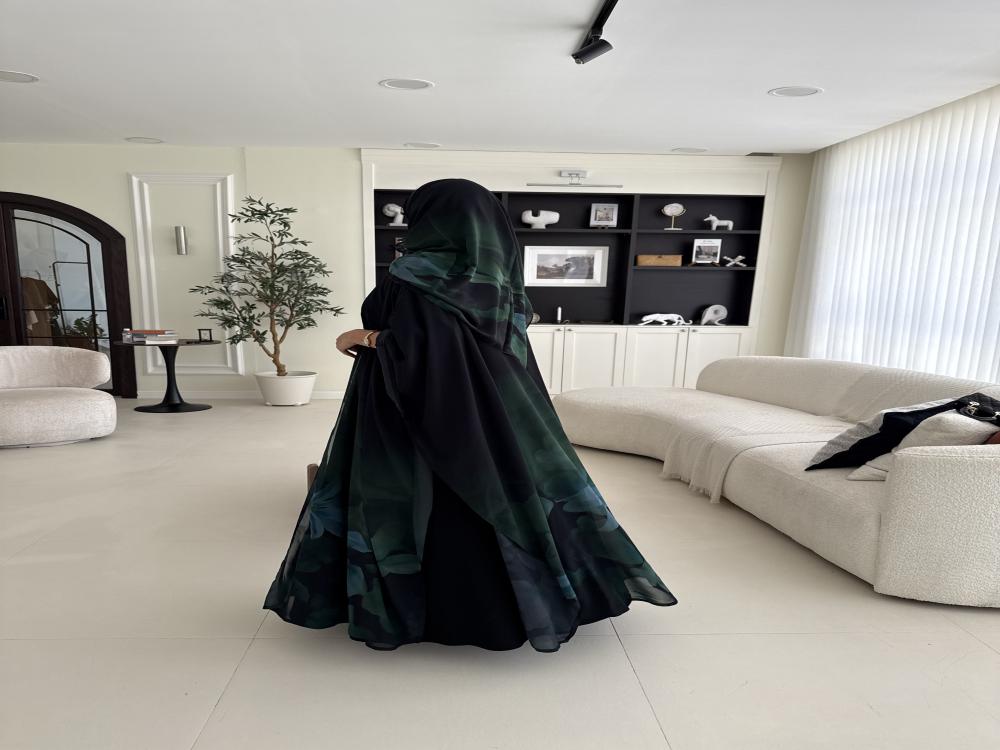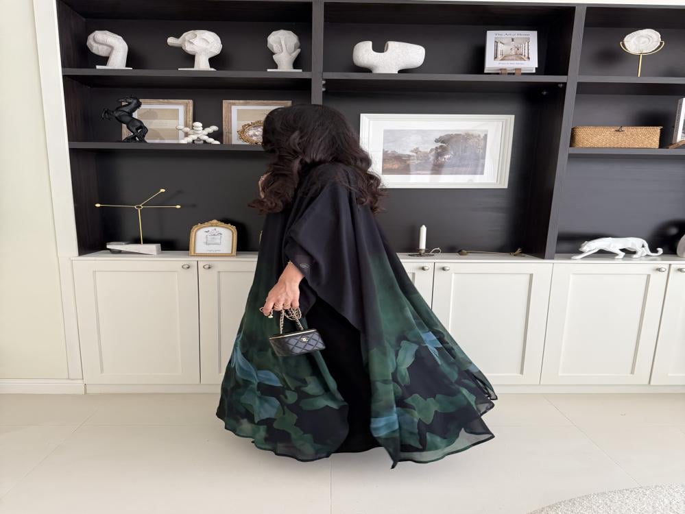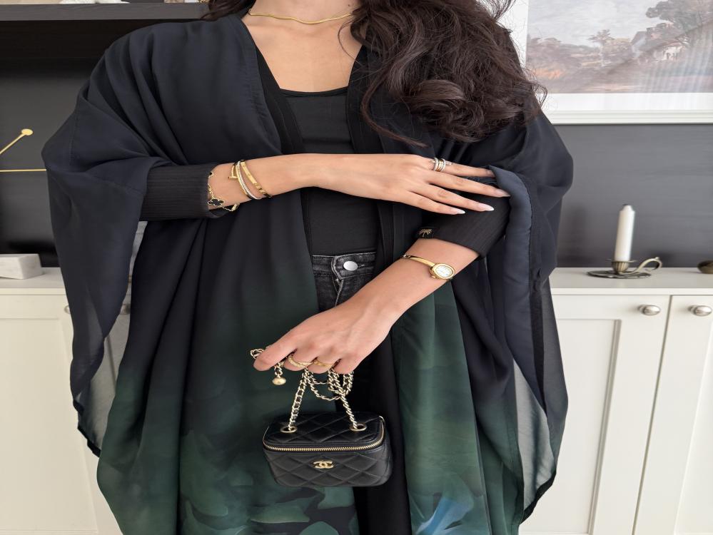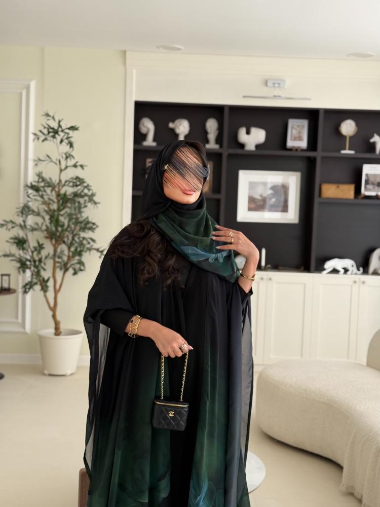 نوع المنتج :عبايه قصة شال شيفون اسود ومن الاسفل مموج بالاخضر مبطن بقماش مستقبل كوري بأكمام استرتش .